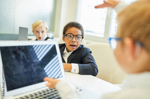 Group of children as a business team at laptop computer