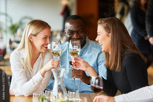 Freunde im Bistro beim Zuprosten mit Glas Wein