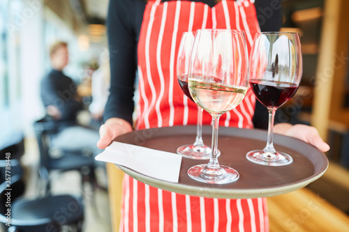 Junge Kellnerin trägt ein Tablett mit Kaffeetassen