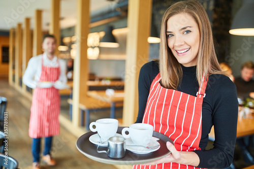 Junge Kellnerin trägt ein Tablett mit Kaffeetassen