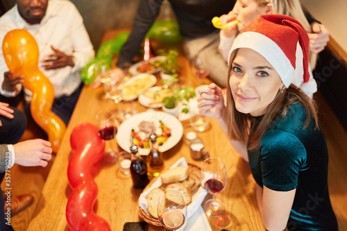 Frau mit Nikolausmütze auf einer Weihnachtsfeier