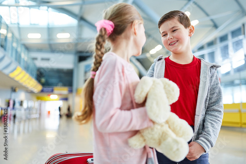 Kleiner Junge umarmt seine Freundin im Flughafen