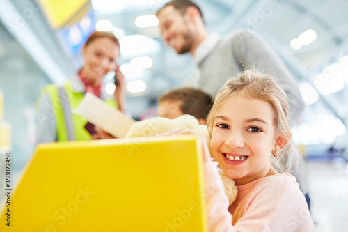 Kleines Mädchen am Check-In Schalter am Flughafen
