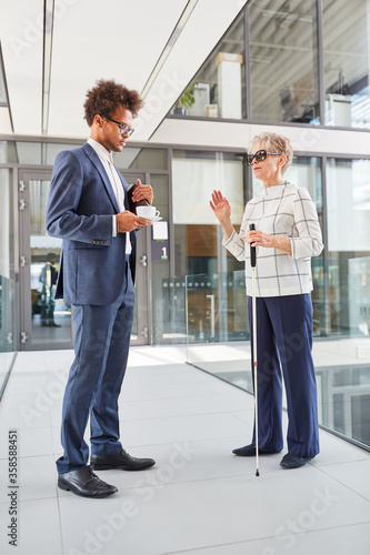 Geschäftsmann und blinde Kollegin beim Smalltalk