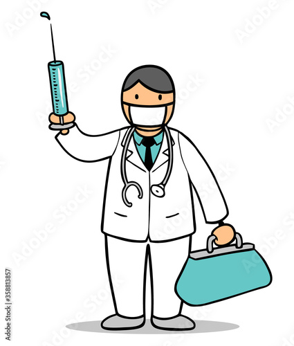 Cartoon Arzt mit Spritze und Mundschutz gibt Impfung