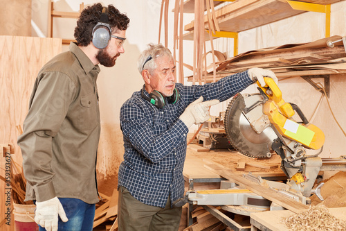 Zufriedener Senior im Rollstuhl betreut vom Sohn