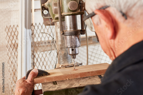 Schreiner bohrt ein Loch in ein Holz Werkstück