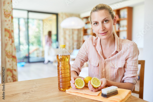 Hausfrau reinigt Glas Schüssel mit Zitronensäure