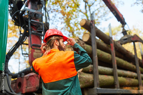 Waldarbeiter auf Forstkran von Forwarder im Wald