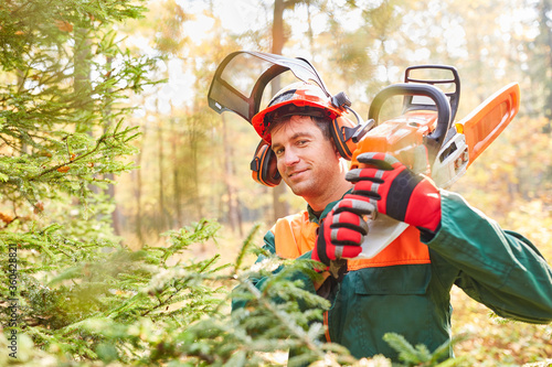 Mann als Forstwirt und Holzfäller in Schutzausrüstung