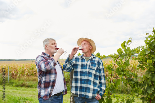 Zwei Erntehelfer trinken ein Glas Rotwein