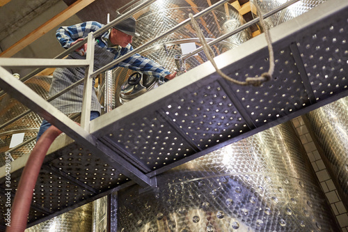 Eimer und Schlauch am Gärtank in der Weinkellerei