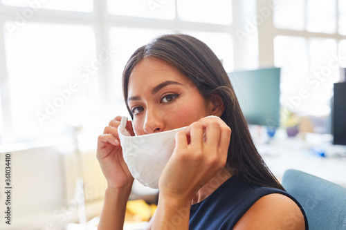 Asiatische Geschäftsfrau setzt Mundschutz oder Gesichtsmaske auf