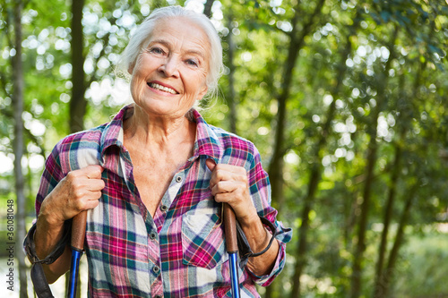 Zufrieden lächelnde Seniorin beim Nordic Walking