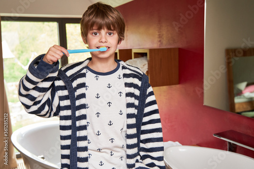 Lachender Junge sitzt fröhlich auf einem Stuhl