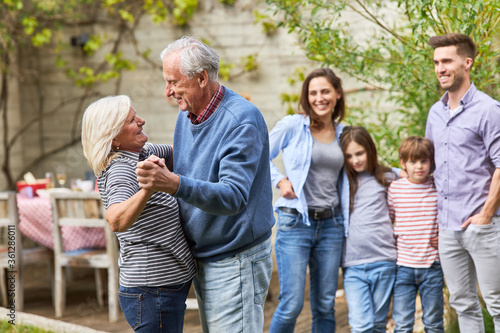 Glückliches Paar Senioren tanzt zusammen im Garten