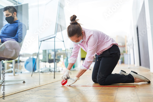 Geschäftsfrau markiert Boden im Büro mit Klebeband