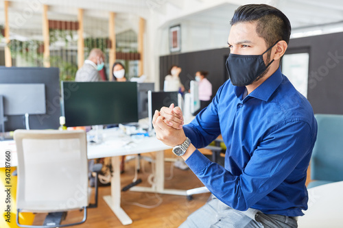 mann im Büro mit Mundschutz beim Hände desinfizieren mit Desinfektionsmittel