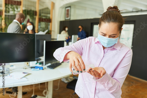 Geschäftsfrau im Büro mit Handdesinfektionsmittel zum Hände desinfizieren