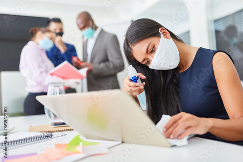 Business Frau mit Mundschutz beim Arbeitsplatz desinfizieren