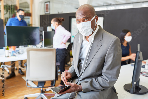 Geschäftsmann mit Smartphone und Mundschutz im Büro