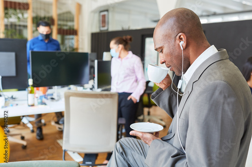 Business Mann mit In-Ear Kopfhörer und Kaffeetasse