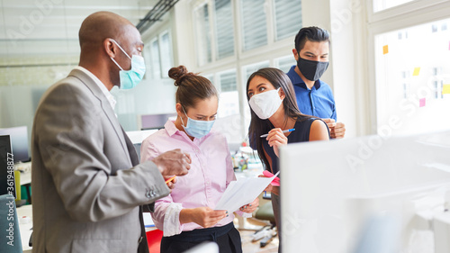 Business Team mit Mundschutz in einer Projekt Besprechung