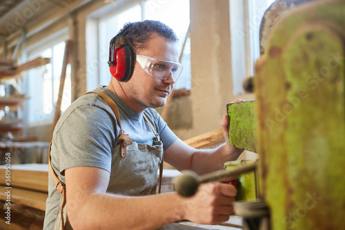 Carpenter apprentice with hearing protection on a machine
