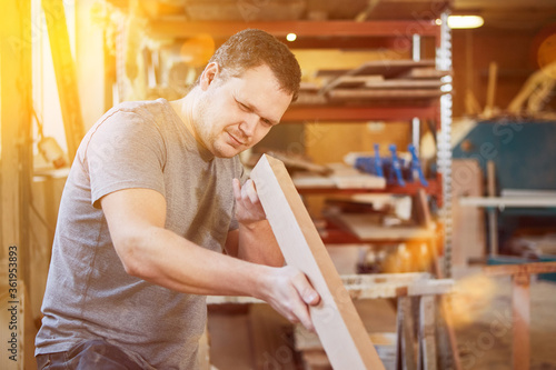 Schreiner Lehrling kontrolliert Qualität von Kantholz