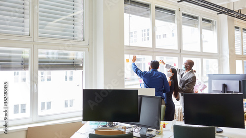 Business Team mit Mundschutz im Großraumbüro