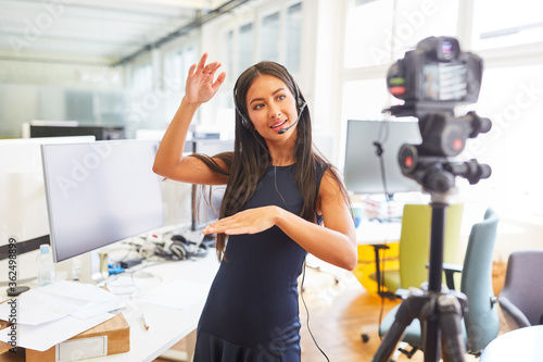 Business woman with headset recording video