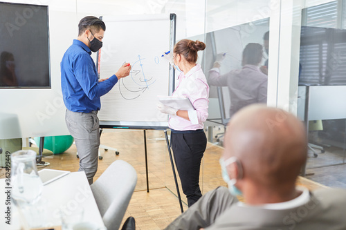 Business Frau mit Mundschutz wegen Covid-19 im Meeting