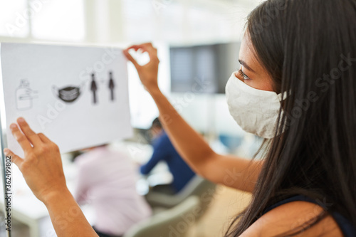 Geschäftsfrau befestigt einen Aushang mit Hygieneregeln