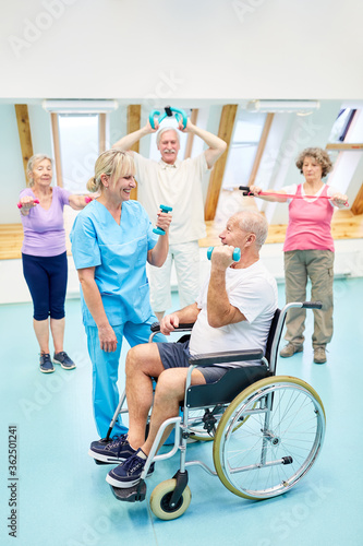 Seniorin im Rollstuhl in der Fitness Gruppe