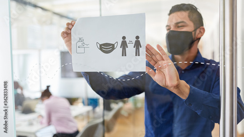 Business Mann befestigt Aushang mit Hygieneregeln im Büro