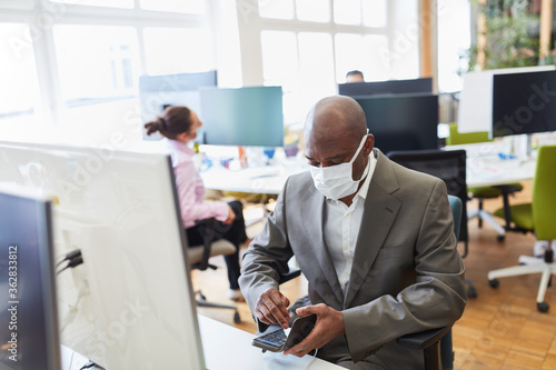 Geschäftsmann mit Smartphone und Mundschutz im Büro