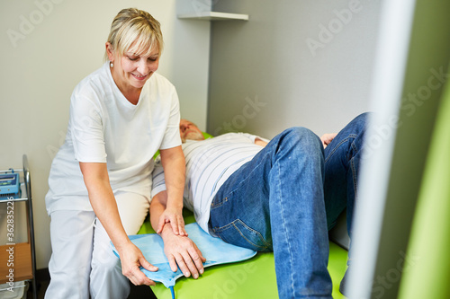 Arzt befestigt Vakuumelektroden am Bein von Patient