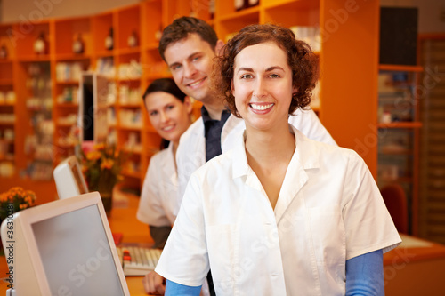 Drei Apotheker hinter Theke