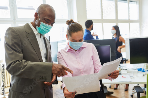 Geschäftsleute mit Mundschutz reden im Büro über Dokument