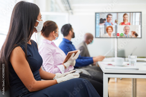 Geschäftsleute mit Maske im Meeting mit Videokonferenz