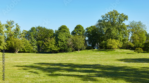 Grüne Wiese im Park mit Bäumen vor einem blauen Himmel