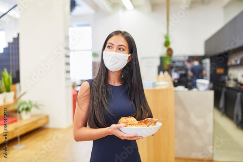 Junge Business Frau mit Mundschutz in der Cafeteria