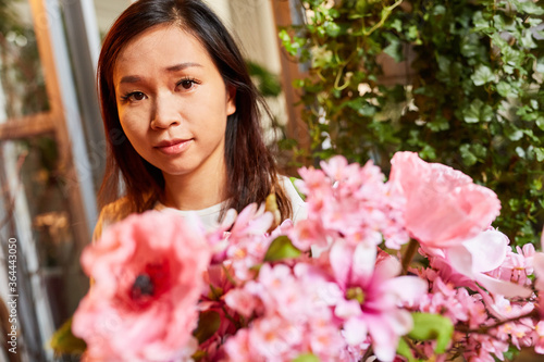 Floristin mit Auswahl an Blumen im Blumenladen