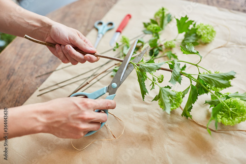 Close-up of gardener holding pruning shears and freshly cut herbs