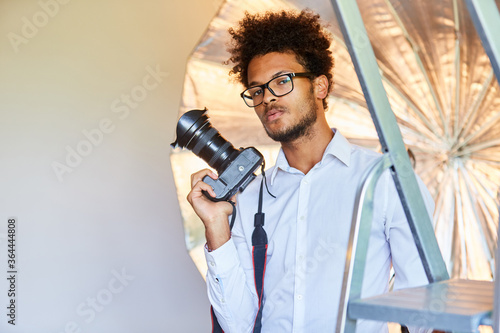 Lächelnder Fotograf mit Spiegelreflexkamera
