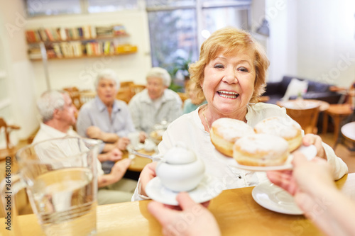 Seniorin holt sich frische Pfannkuchen für die Kaffeerunde im Seniorencafe