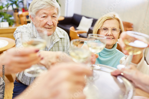 Senioren stoßen an mit einem Glas Weißwein und feiern zusammen Geburtstag