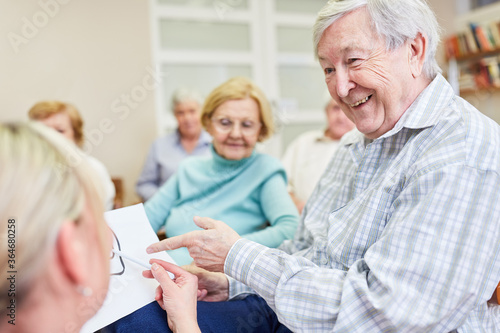 Gruppe Senioren mit Psychotherapeutin in einem Gesprächskreis im Altenheim