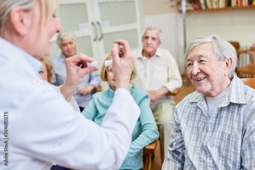 Ärztin mit Dosierinhalator in einer Gesundheitsberatung für Senioren im Altenheim
