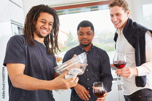 Männer als Freunde in WG Küche stoßen mit Glas Rotwein an